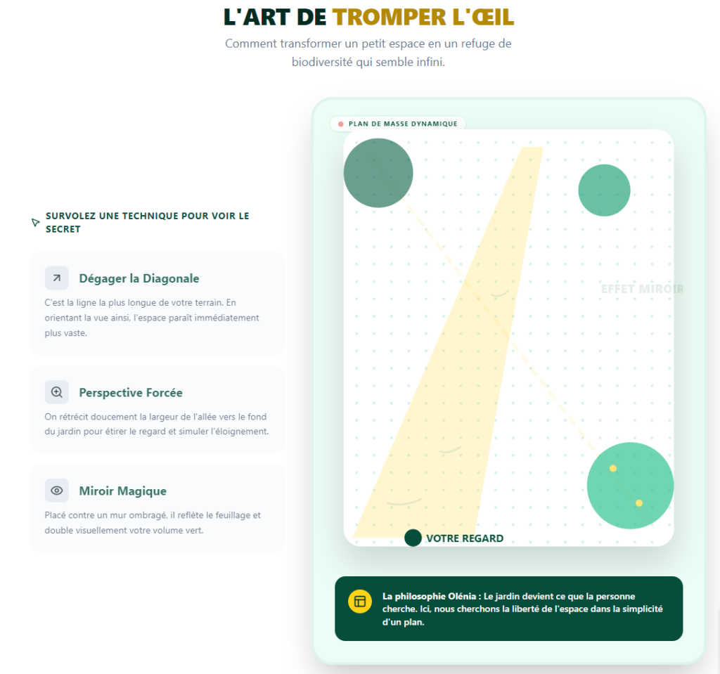 Pour repousser les limites visuelles, libérez l’axe diagonal de votre parcelle. Plantez massivement sur les bords pour dissimuler les murs et les clôtures. L’ajout d’un miroir extérieur reflétant les végétaux apporte également une incroyable profondeur.