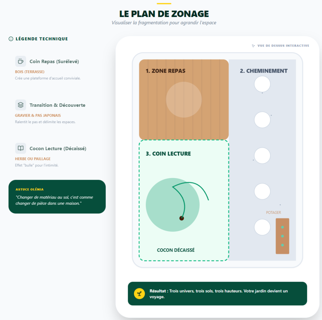 Diviser un petit espace permet paradoxalement de le rendre plus grand. C’est le principe du zonage. Créez des micro-espaces : un coin lecture à l’ombre, un mini-potager au soleil, un coin repas.