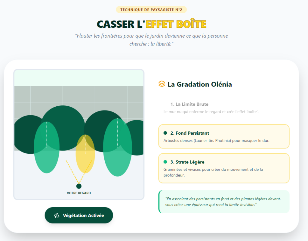 Un petit jardin rectangulaire enferme souvent le regard. Pour casser cet effet de “boîte”, il faut cacher les limites physiques du terrain. Plantez généreusement le long de vos clôtures ou murs mitoyens.